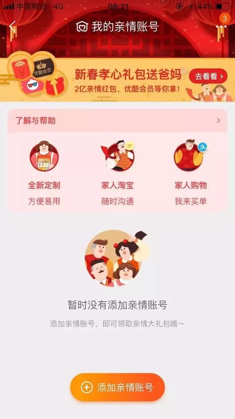 而就在2月3日,手淘出现了亲情账号的入口。所谓亲情版就是在原版淘宝的登陆界面加了一个“建立亲情账号”的入口。由子女建立亲情账号并且选择自己的身份,邀请可能并不太会独立操作 APP 的父母来绑定账号。