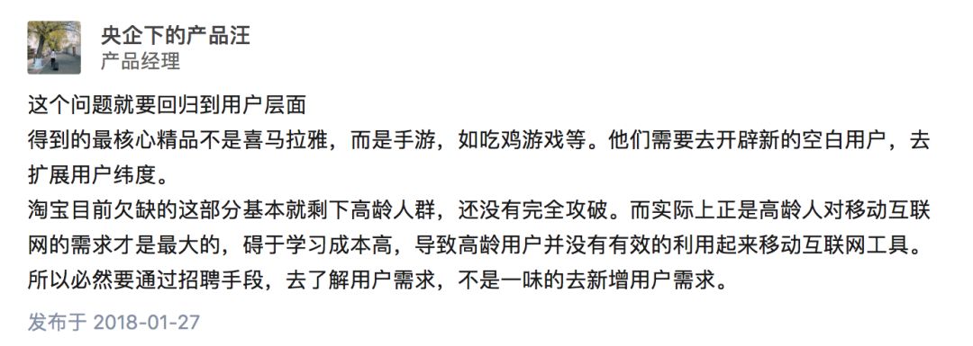 在这则阿里的招聘启事中,这些应聘的爷爷奶奶的主要工作是产品体验师,工作内容主要是以中老年群体视角出发,深度体验“亲情版”手淘产品,发现问题并反馈问题;定期组织座谈或小课堂,发动身边的中老年人反馈“亲情版”手淘使用体验;通过问卷调查、访谈等形式反馈中老年群体对产品的体验情况、用户需求。简单点说,就是用户调研。