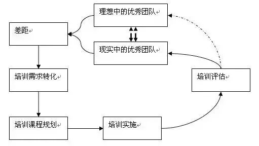 在这张培训地图上,培训评估与理想中的优秀团队之间的连线是虚线,这说明,任何有效的培训也许只能达到促使团队水平上升一个层次的目的,而无法真正促使自己的团队达成理想的水平。不过,这也是企业培训永无止境的原因。