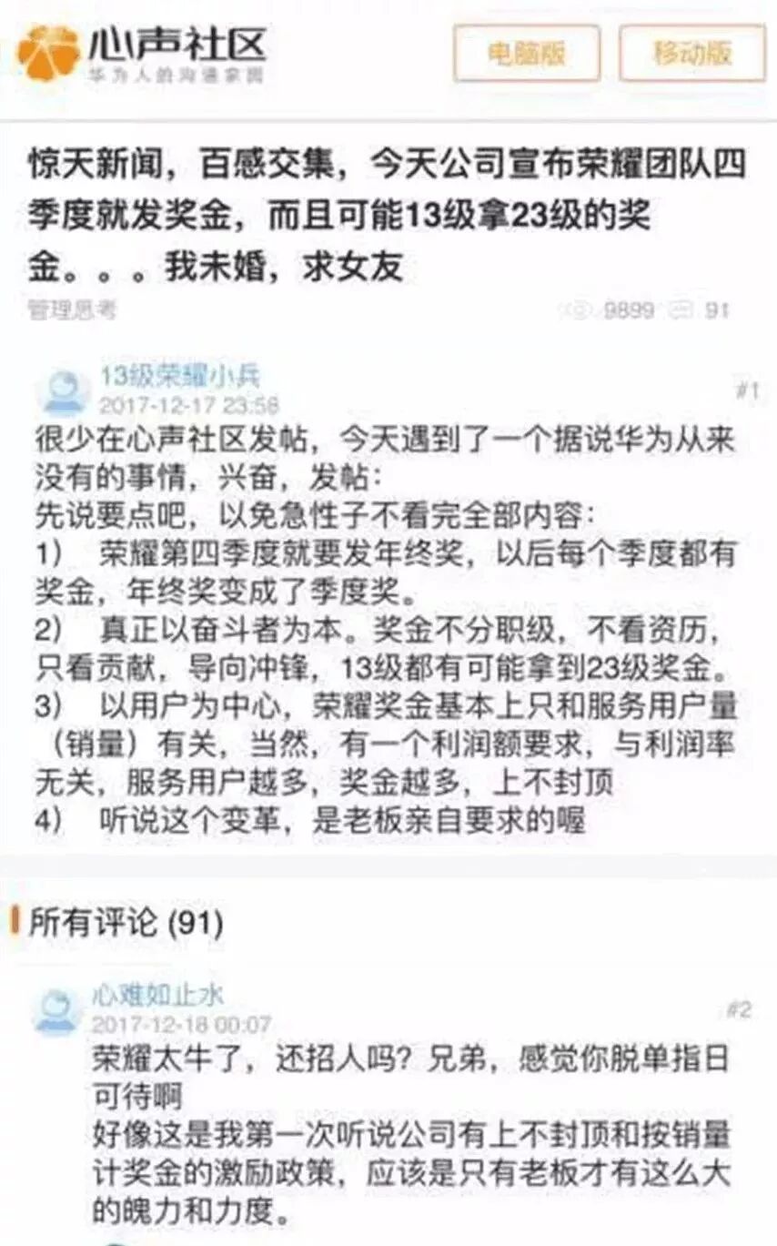 华为荣耀员工在内部论坛心声社区称,今年的奖金第四季度就发。