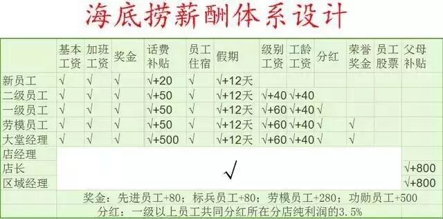 海底捞的薪酬组织架构还是比较复杂的,将员工分为这么多级,一点也不扁平化。另外,每一个员工,哪怕是新员工的工资组成都分为了至少4部分,越重要的员工工资组成就越多。甚至还给重要员工的父母发福利。